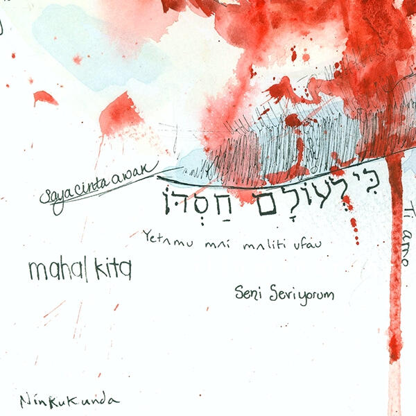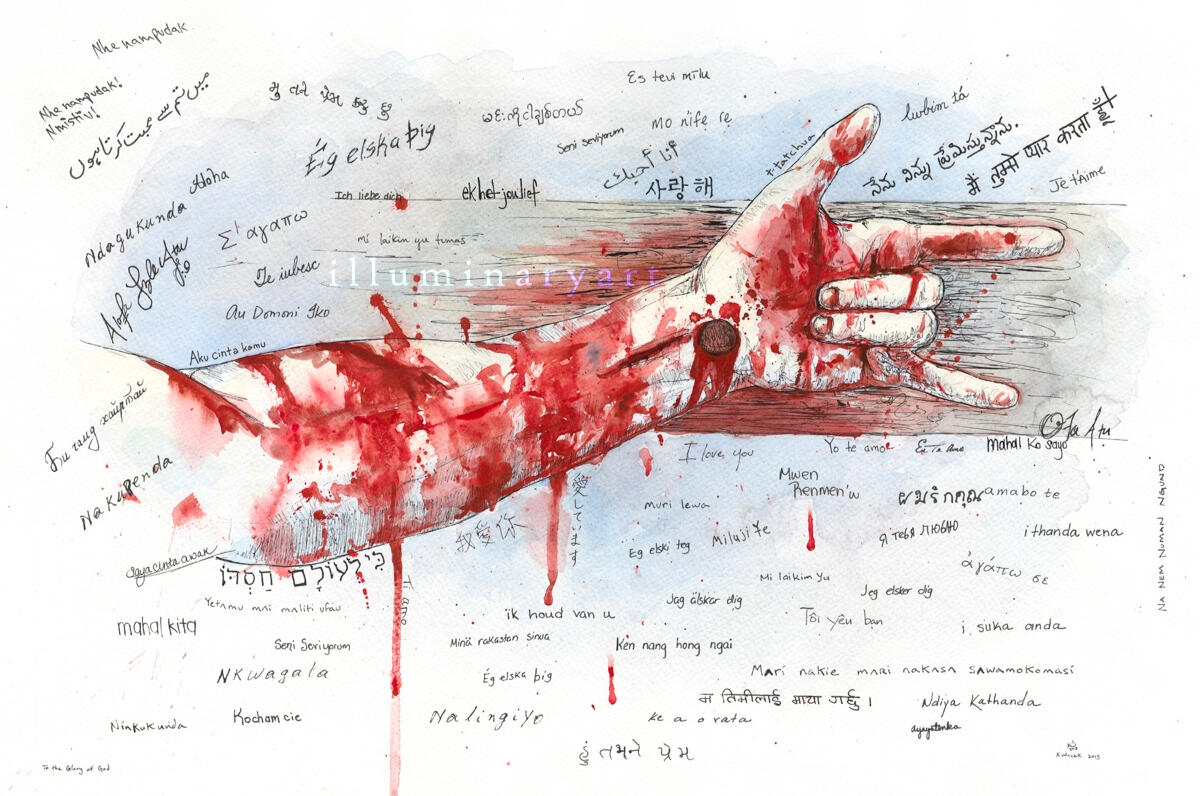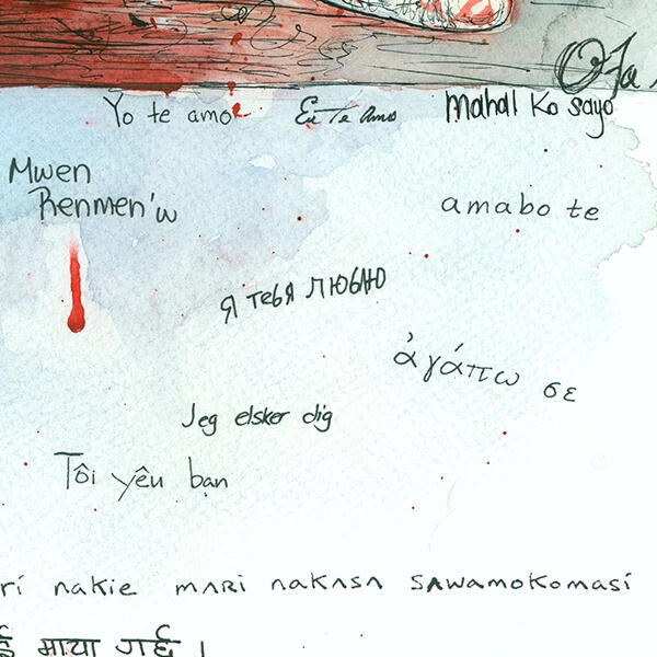 lay down one’s life for one’s friends.“ John 15:13This painting is a collaborative work with dozens of friends and strangers to write the phrase "I love you" in the native languages spoken on my college campus. I ended up with sixty-seven languages. Since then, I have continued to add to the languages on the painting.The languages included are: