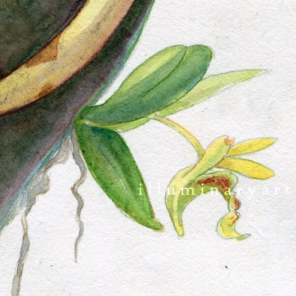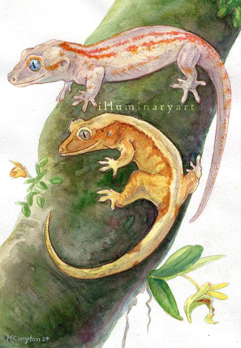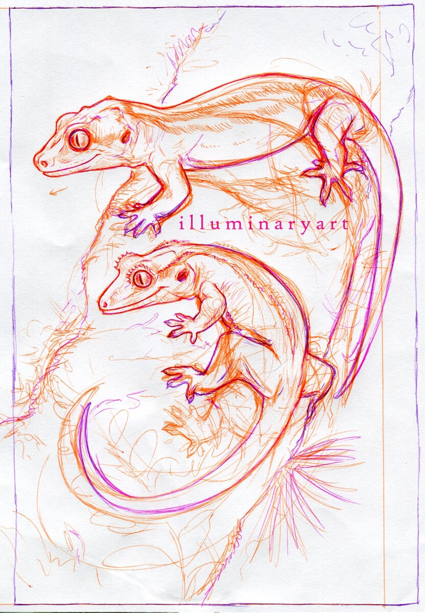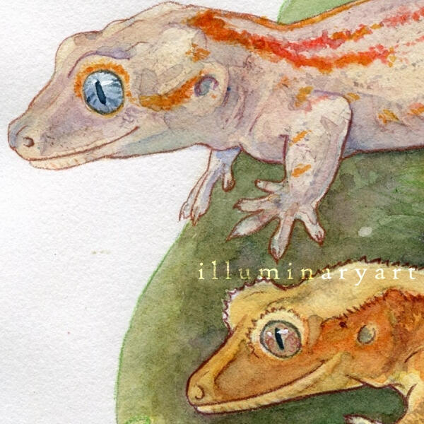 A commission of the commissioner's favorite pair of geckos: a gargoyle gecko and a crested gecko. They are posed on a mossy branch with orchids from their native New Caledonia.The initial sketch was done all in colored ballpoint pen and was a favorite part of the process.