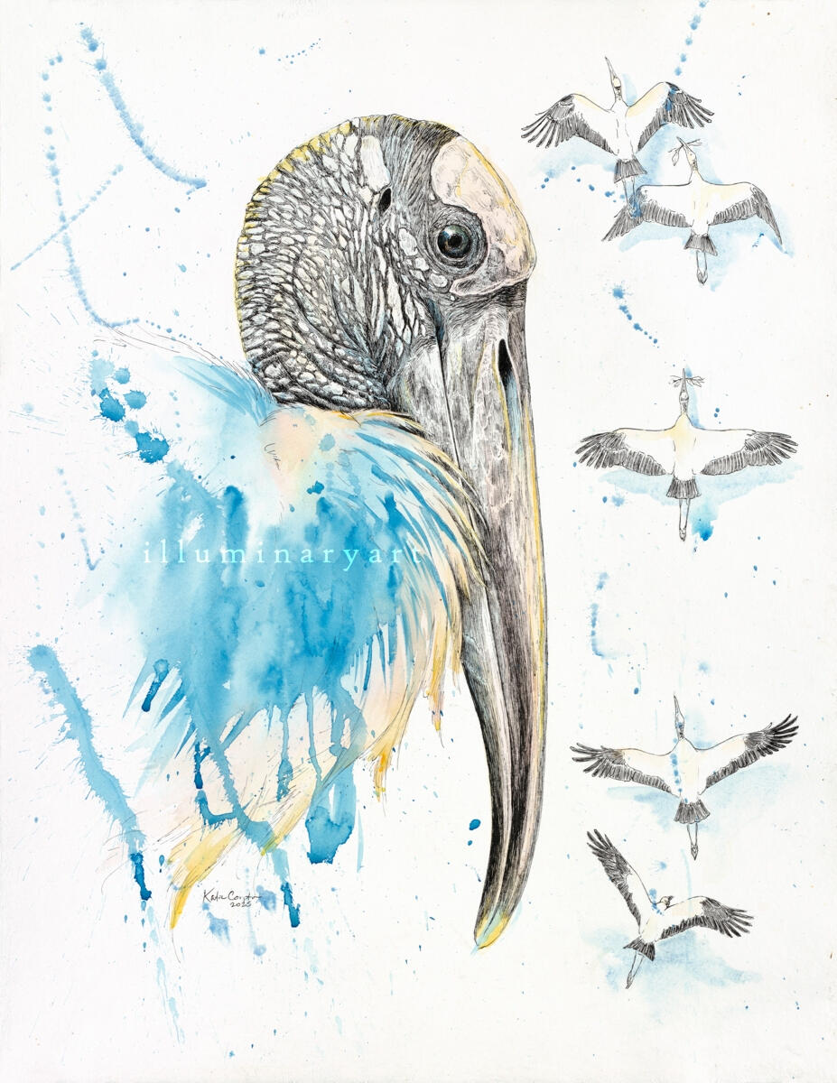 This drawing started with an infatuation with wood storks some years ago while I was in college, and carried over in a little pen sketch made during church more recently. Since then, it bloomed into one of my largest pieces to date, one that saw me actually out in the field, or the swamp rather, to gather my own references pictures. Naturally, I didn't realize my camera was non-functional until I arrived and all I came away with was a small sketch, made high up on an observation platform covered in poison ivy while I was very pregnant. Many thanks to Dr Ramstad for facilitating that outing!